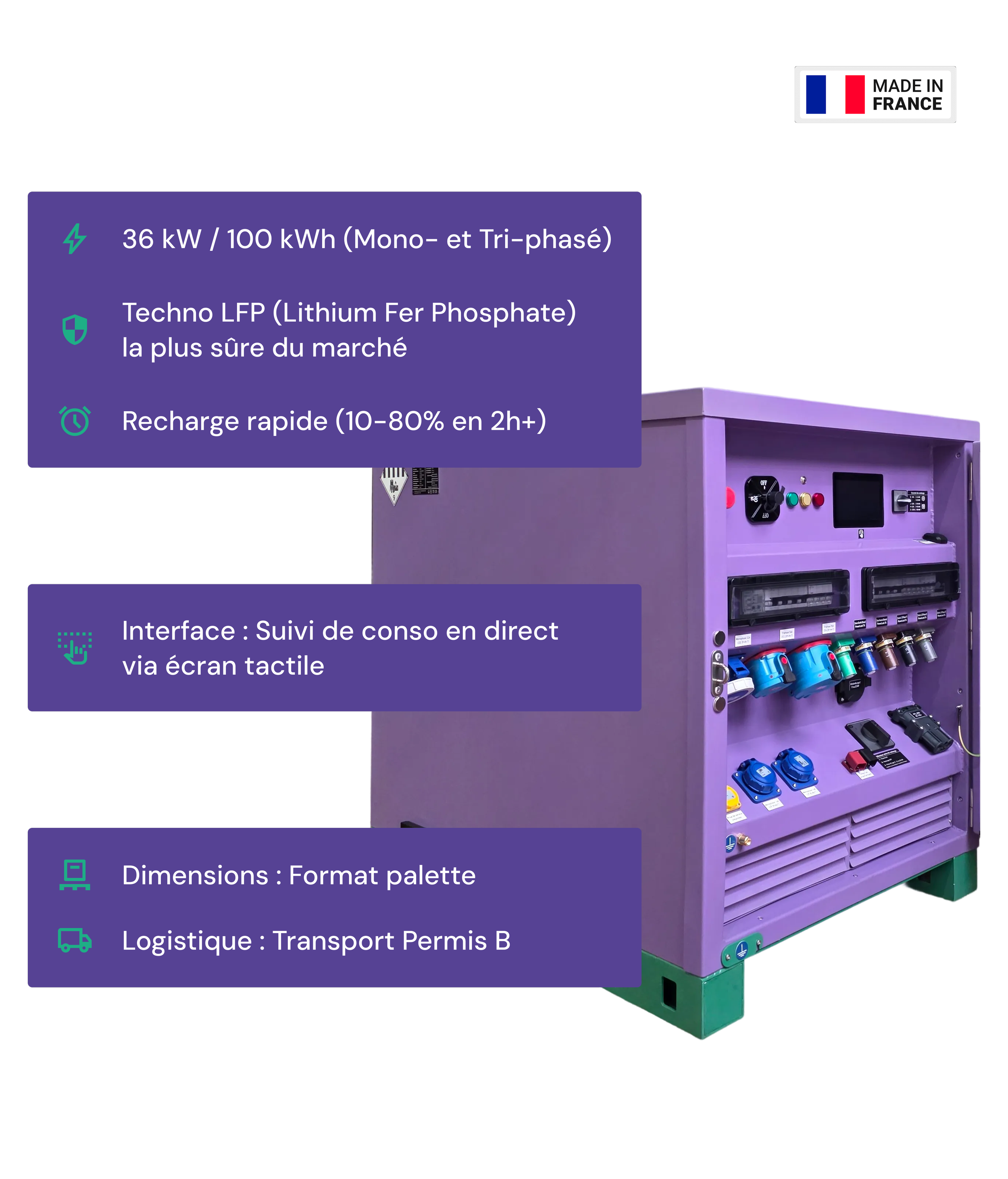 Une batterie puissante et sécurisée pour tous vos événements, pour enfin en finir avec les groupes électrogènes à essence.